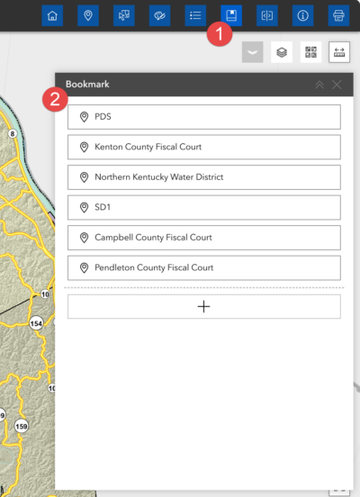 - Click on the “Bookmark” icon in the toolbar. The widget will open on the map viewer screen that is titled “Bookmark.”
