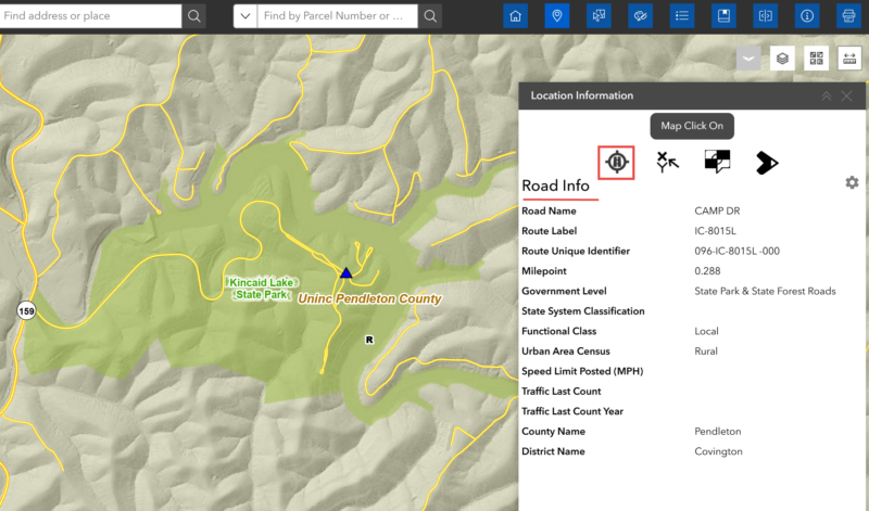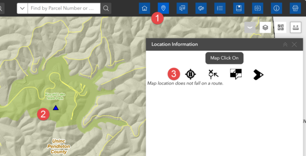 If you click over a road, Information available about the road will be visible. If the site chosen is not close enough, it will let you know that the map location does not fall on a route.