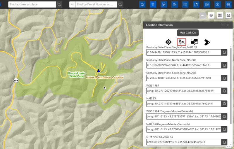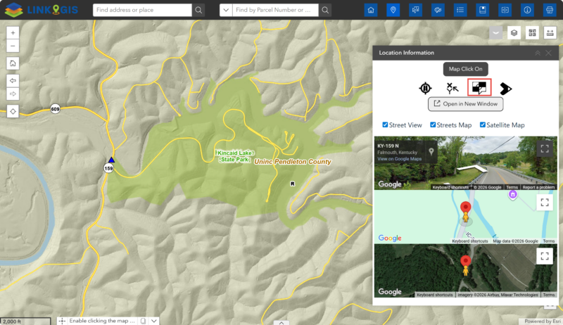 The Location Information Widget allows users to view road information, find coordinates for a location in multiple coordinate systems, view oblique imagery and street view of a place, all while in the LINK-GIS map viewer. Follow these steps to use the Location Information Widget:
