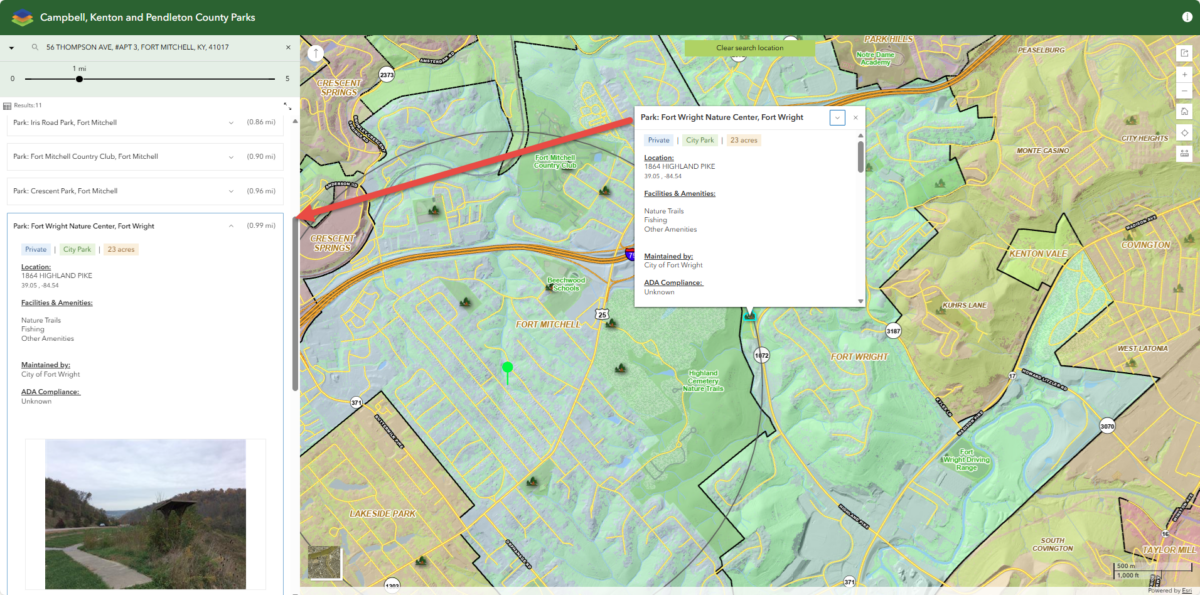 Pop-ups in the Park Finder map display detailed information about each park’s facilities and amenities. Once a search area has been selected, click on any park icon on the map to open its pop-up.