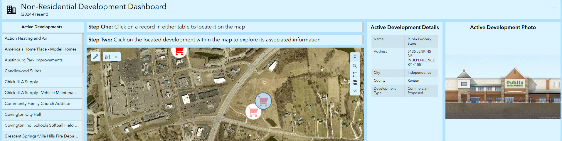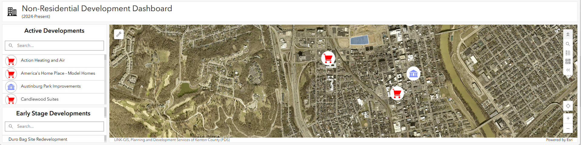 The Non-Residential Development Dashboard, based on the Kenton County Development Tracker, is a web-based application intended to showcase various non-residential projects underway throughout Kenton County. The dashboard highlights commercial, industrial, and institutional projects that are currently underway, while also showcasing projects that remain in their early stages, some of which will include associated RFP/opportunity information. This application is filterable by project name, with icons highlighting the type of project.