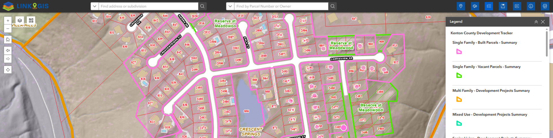 The LINK-GIS map viewer is designed to allow users to search addresses, PIDNs and Owner Names for Kenton, Campbell and Pendleton Counties. Users also have access to dozens of other data layers, including zoning, flood zones, voting precincts, control monuments, places of interest, as well as, an array of tools to customize and print a map.