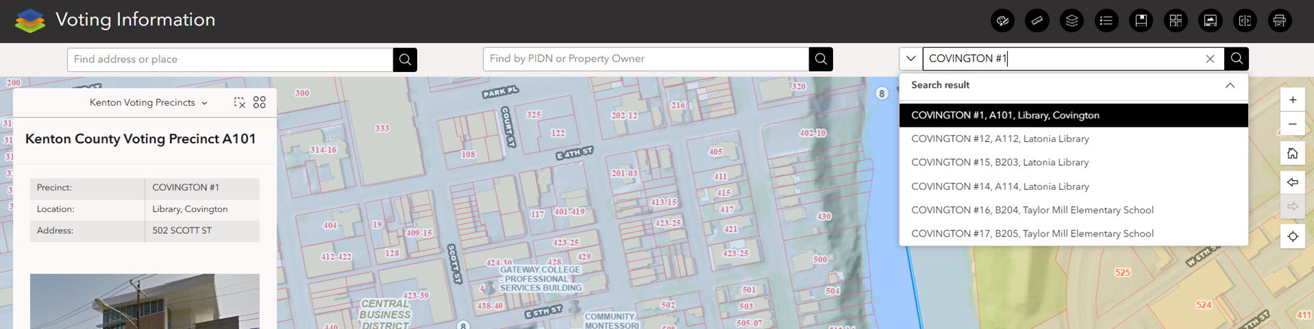 The Voting Information map shows voting precincts and polling locations in Campbell, Kenton, and Pendleton Counties. This easy to use map allows the user to search polling locations by clicking on precincts on the map, or search by precinct name in the Find Polling Location.